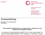 „Die Gemeinsame Wissenschaftskonferenz (GWK) hat sich heute darauf geeinigt, eine Nationale Forschungsdateninfrastruktur (NFDI) aufzubauen und gemeinsam zu fördern. Dieses Programm ist Teil eines für Hochschulen und außeruniversitäre Forschungseinrichtungen wichtigen Förderpakets, auf das sich die GWK geeinigt hat.